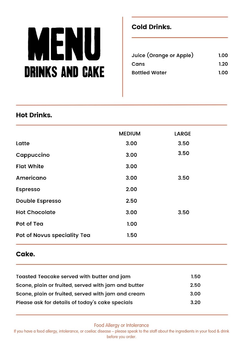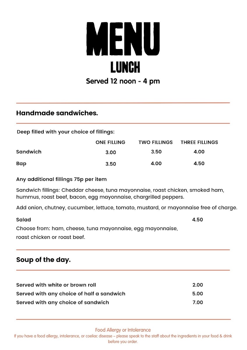 The cakes and scones section features items such as toasted teacakes served with butter and jam, as well as plain or fruited scones available with jam and butter or jam and cream. This selection provides a range of traditional baked goods appropriate for a coffee or tea accompaniment.