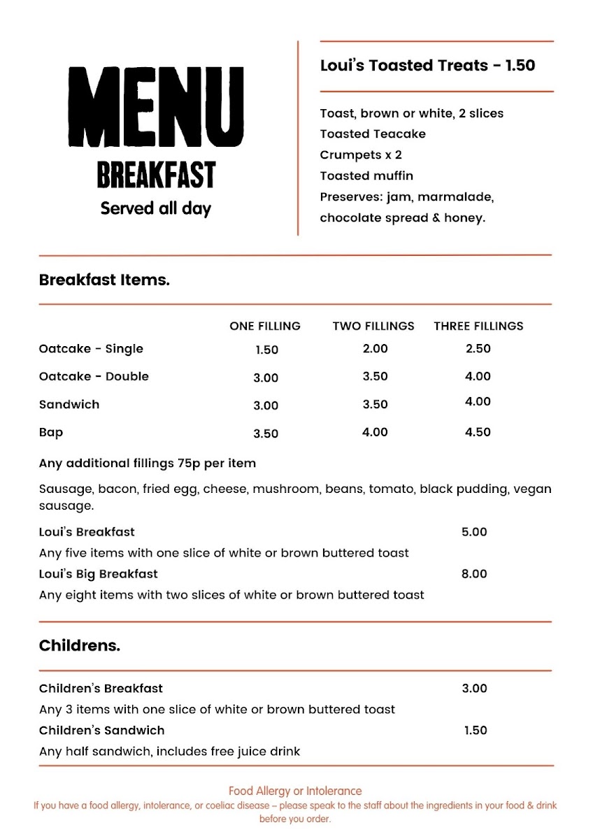 The menu at Loui's Kitchen offers a variety of options suitable for breakfast, light meals, and casual coffee breaks. It is organized into distinct sections including cakes and scones, cold drinks, and other light food items.